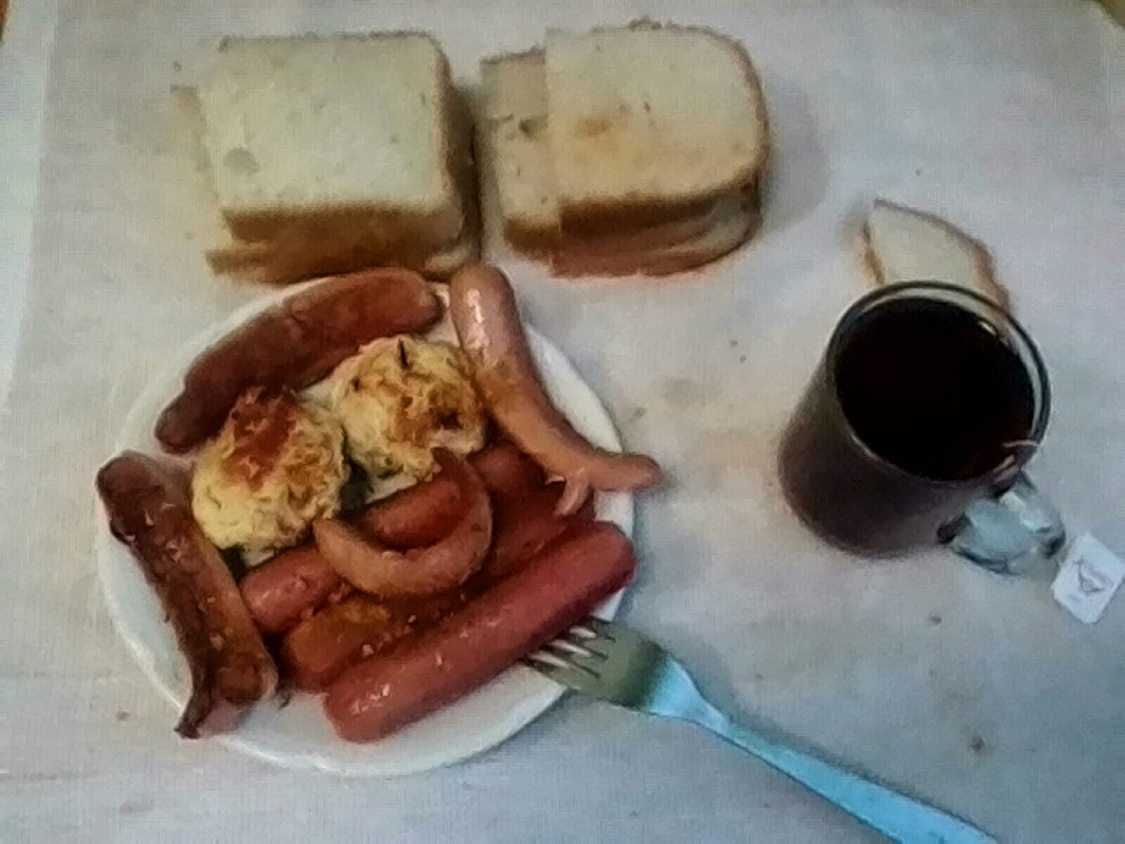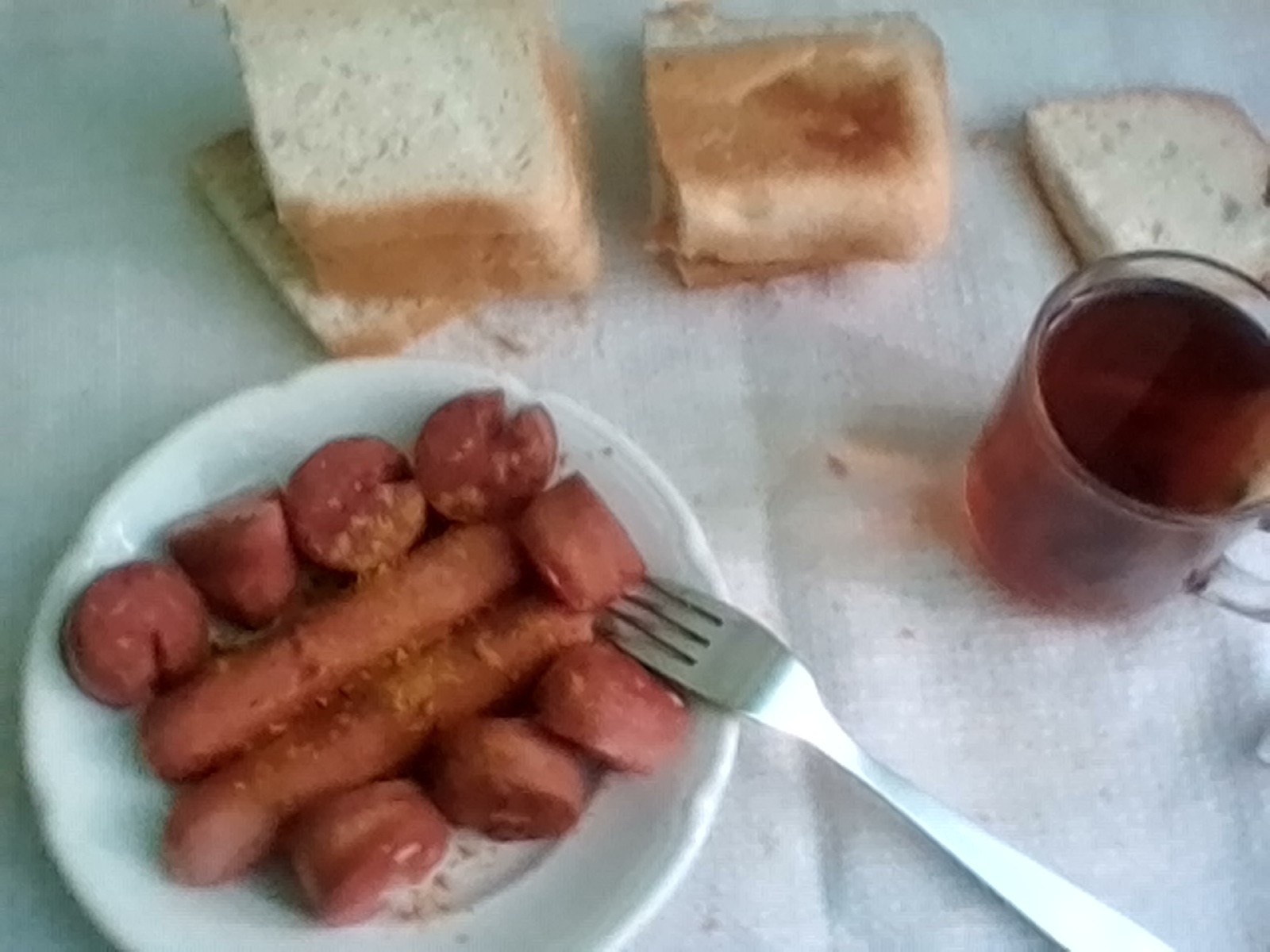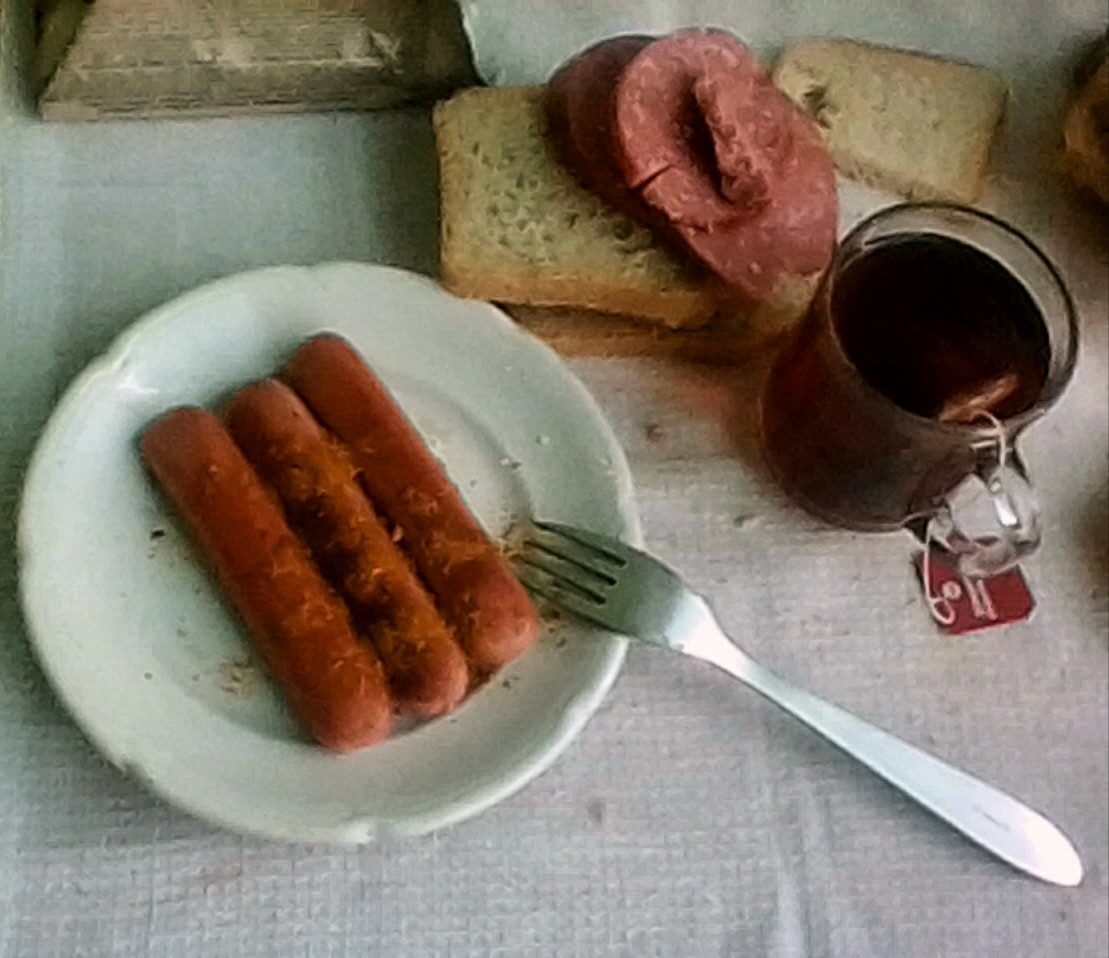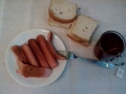 сосиски деревенские и молочные, хлебушек, чай с чабрецом
