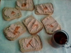 Краинская колбаса, деревенские сосиски, хлеб и чай с чабрецом, очень хорошо